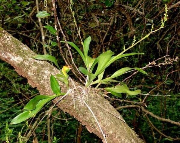 Yellow blooms burst from overlapping leaves. Propagate Lockhartia imbricata via stem cuttings this spring.