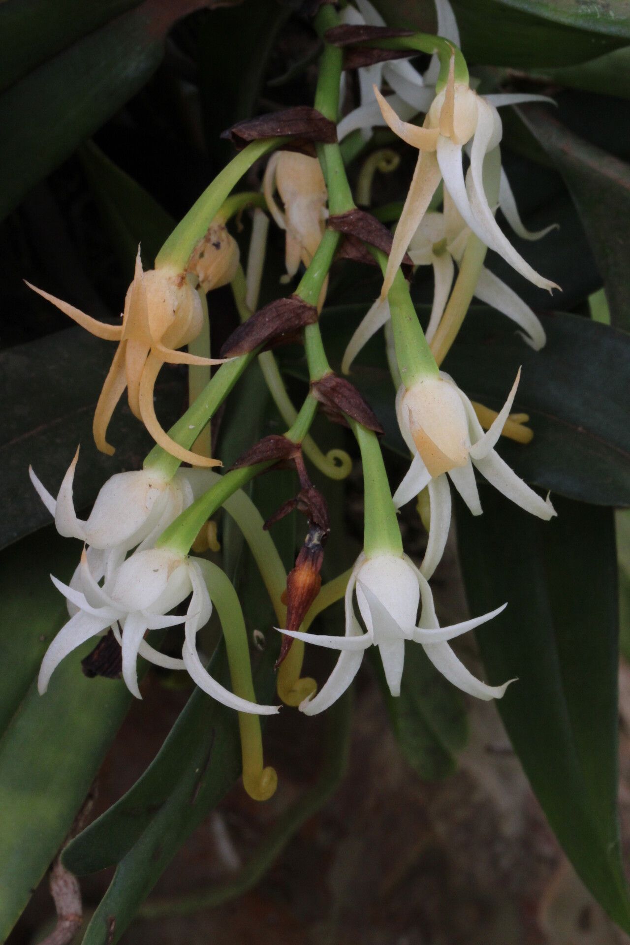 Fragrant, star-shaped blooms cascade. Propagate Cyrtorchis hamata from keikis this spring/summer to multiply its nocturnal perfume and grace.
