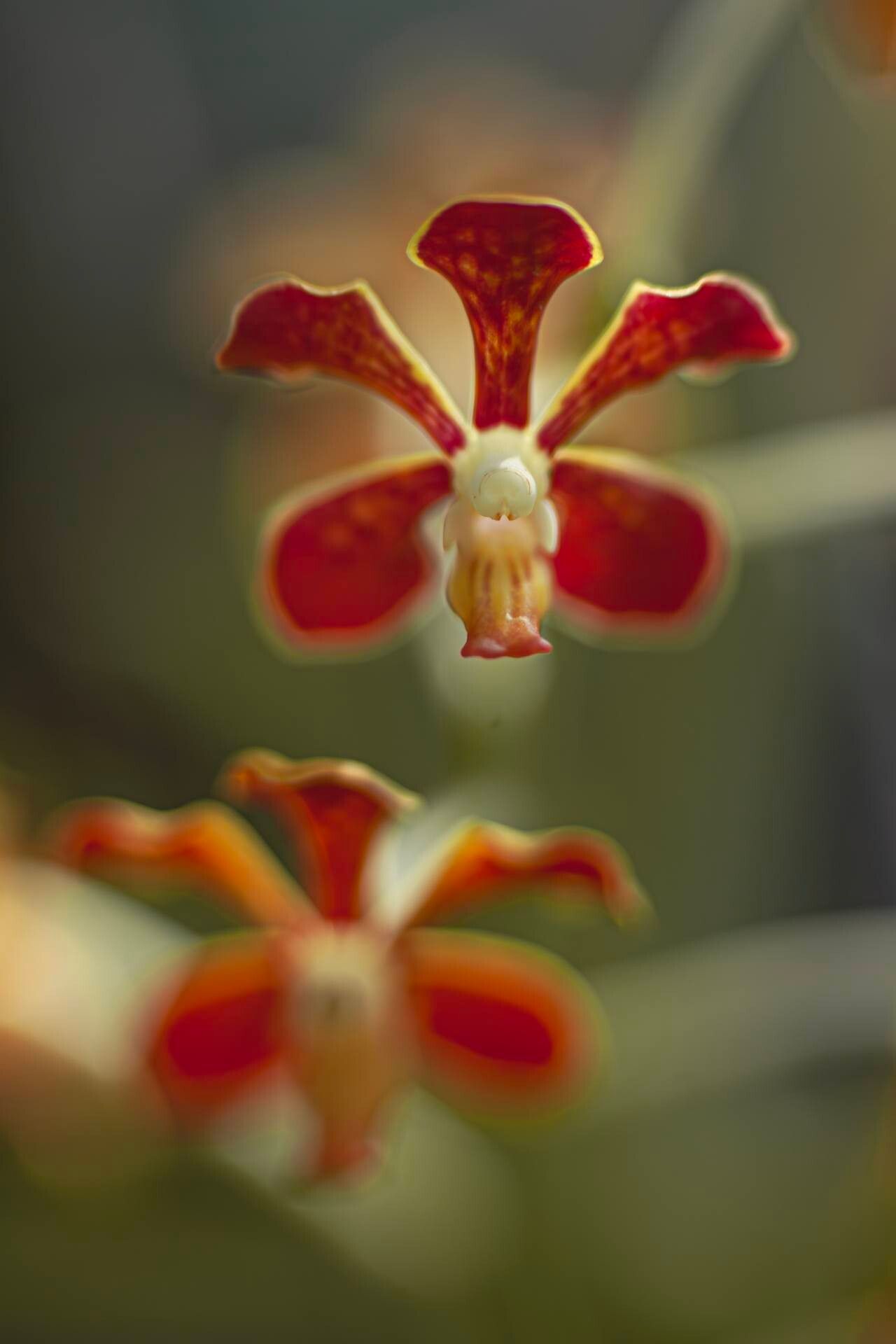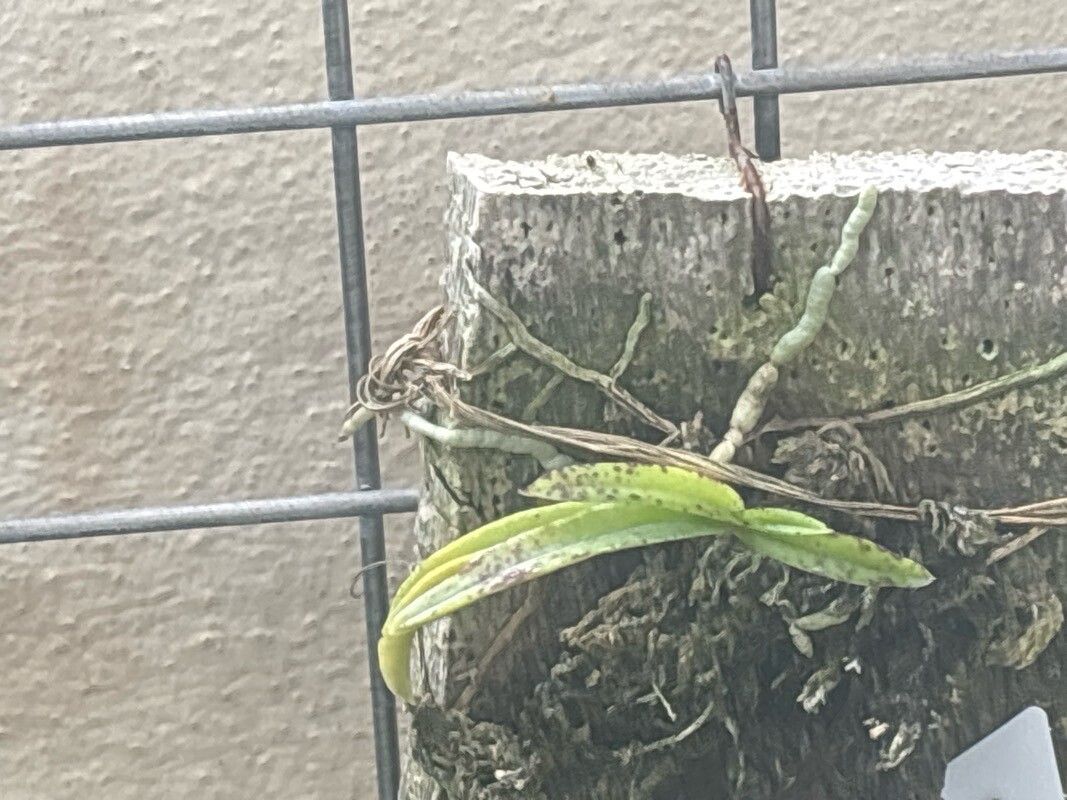 Vanda curvifolia keikis emerge, aerial roots reaching. Spring’s warmth signals a new bloom’s tender birth.